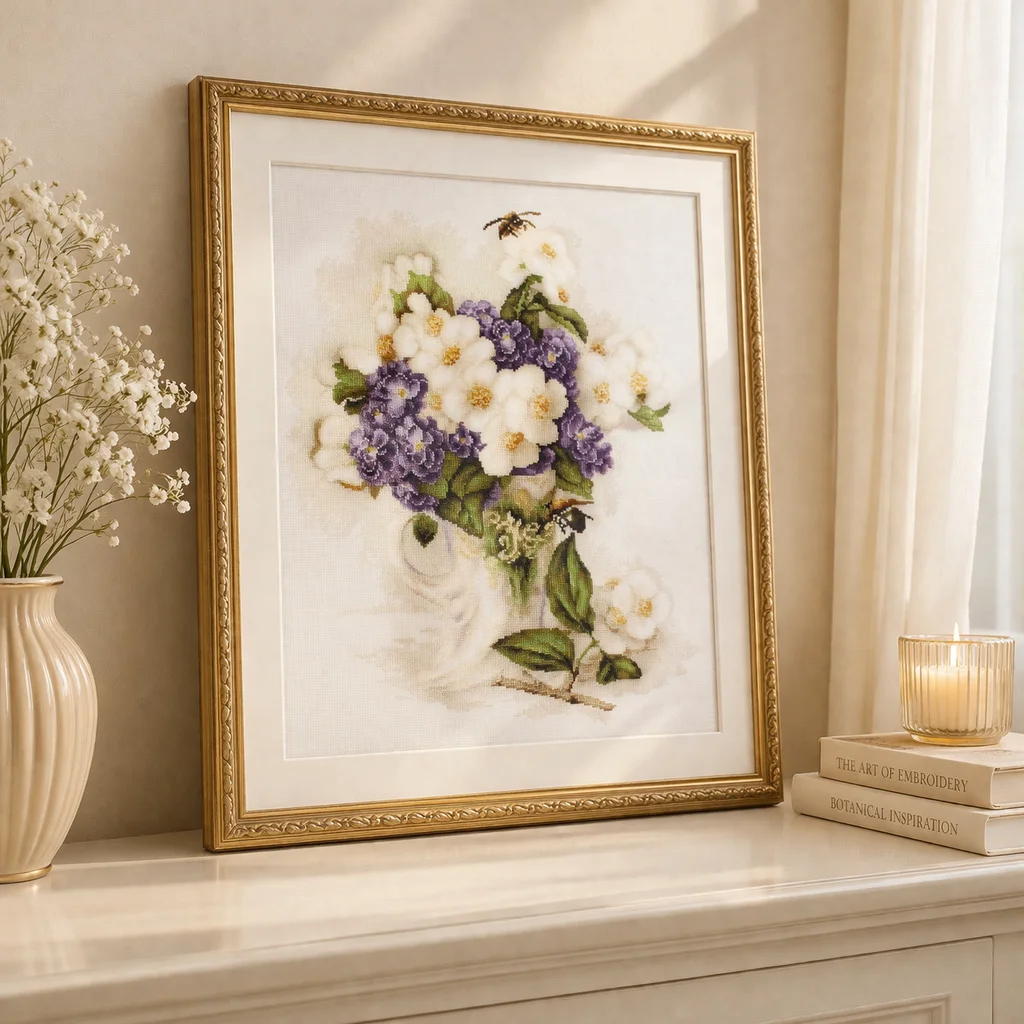 Petit Point siuvinėjimo rinkinys „Jazminų žiedai vazoje“ – aukštos kokybės komplektas su Zweigart 25 ct. gobeleniniu audiniu (dramblio kaulo spalvos) ir Anchor 100 % medvilniniais siūlais (38 spalvos). Šis modelis leidžia sukurti subtilų, šviesų ir estetišką gėlių paveikslą, kuris puikiai tiks tiek kūrybai, tiek interjero dekorui.