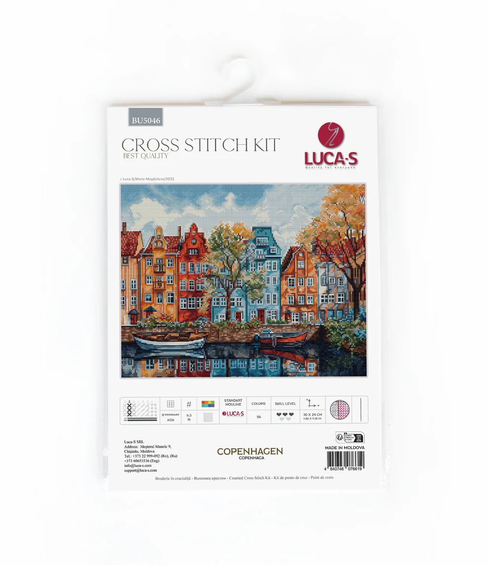 Luca-S siuvinėjimo kryželiu rinkinys „Kopenhaga“ – premium kokybės rinkinys su Zweigart Aida16 audiniu ir Luca-S 100 % medvilniniais siūlais (56 spalvos). Šis siuvinėjimo kryželiu rinkinys puikiai tinka pažengusiems (3/5) ir leidžia sukurti stilingą miesto architektūros motyvą. Idealus pasirinkimas kūrybai, atsipalaidavimui ar dovanai.