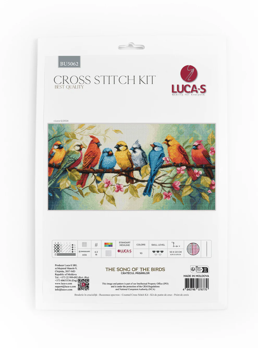 Luca-S siuvinėjimo kryželiu rinkinys „Paukščių giesmė“ – premium kokybės rinkinys su Zweigart Aida16 audiniu ir Luca-S 100 % medvilniniais siūlais (70 spalvų). Šis didesnio formato siuvinėjimo kryželiu rinkinys puikiai tinka pažengusiems (3/5) ir leidžia sukurti įspūdingą, detalų bei gyvybingą paukščių motyvą. Idealus pasirinkimas kūrybai, atsipalaidavimui ar išskirtinei dovanai.
